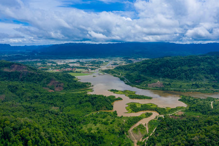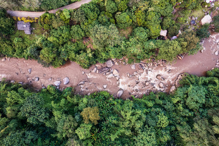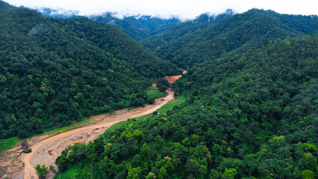 Drone aerial view of a muddy river flowing through a lush green mountain valley after heavy rainfall and flash flood.