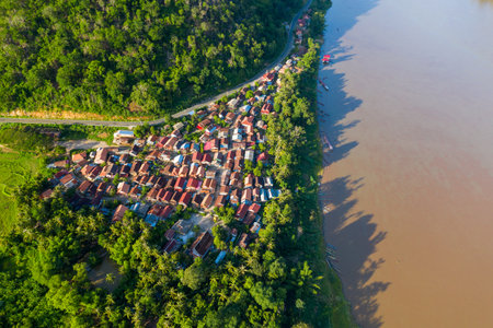 Overhead perspective of a compact riverside village with red rooftops nestled between lush green hills and the muddy Mekong river. The scene features vibrant tropical vegetation, cultivated fields, and moored boats, capturing rural life in Southeast Asia.