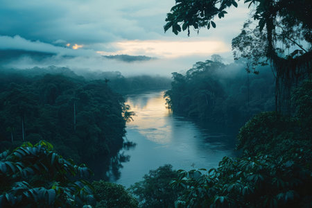 A body of water nestled amidst lush trees and framed by a cloudy sky, Nightfall over a river running through a rainforest, AI Generated