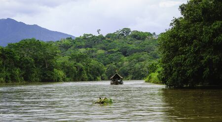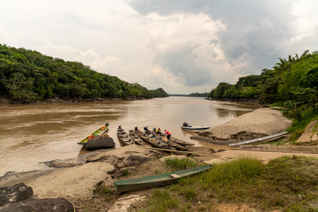 Rocks, amazonian river, boats and jungle in the area of colombian amazon, cloudy and green picture