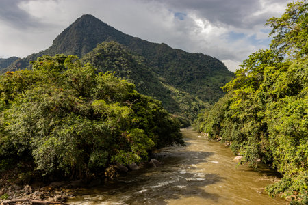 River in a landscape with mountains in the background covered in mist. Colombia.
