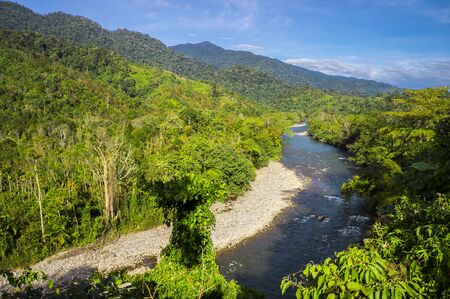 Mountain river in the jungle. Panorama of the river.