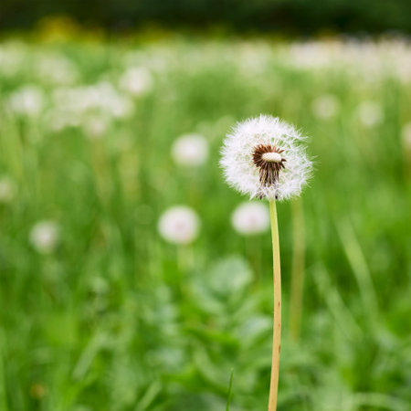 blurred background of green grass and white dandelions