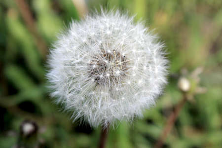 The same white and dry dandelion from the top with a lot of small bunches. Round as a ball, on a hot summer day, on the shady side, with a green, colored, fuzzy soil background. Macro photography.