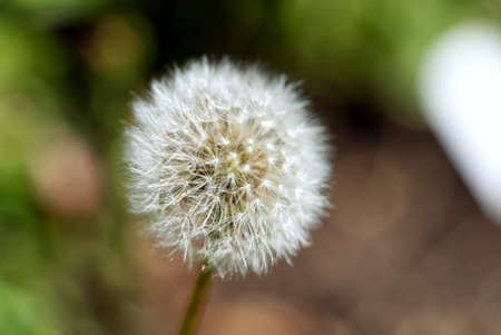 white fluffy dandelion Taraxacum officinale on a green and brown blurred background. close up
