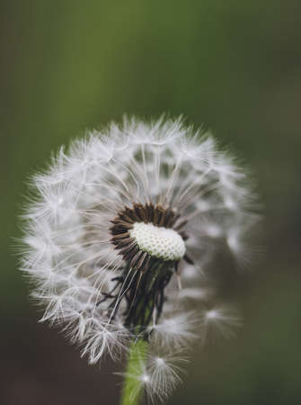 Close up of white dandelion. Blooming blowball in macro on blurry green background. Concept of nature background