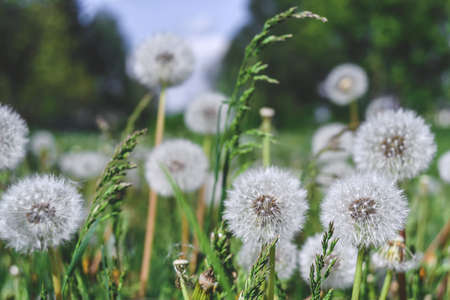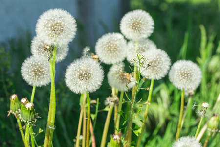 Field of white fluffy dandelions in June. Horizontal frame, close-up.