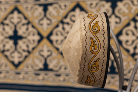 Close-up of a beige Altai tubeteika decorated with a folk ornament on a hanger against blurred carpet with national pattern. Skullcap is popular Asian headdress. Background with copy space