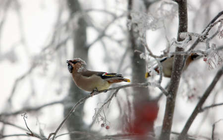 European Goldfinch, Carduelis carduelis, a group small garden colored bird stands on the edge of a frozen lake and wants to drink.
