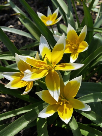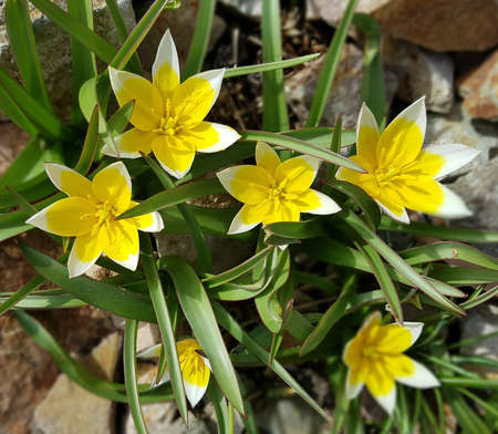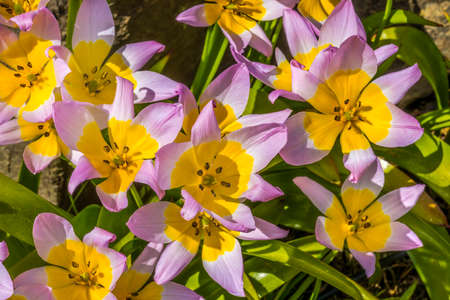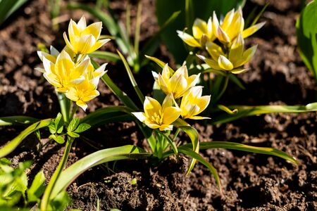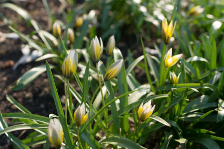 Beautiful yellow tulips (Tulipa tarda) on the flowerbed.