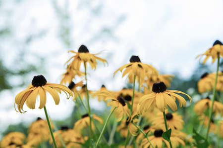 Small yellow flowers in the garden. Shallow depth of field. view from above
