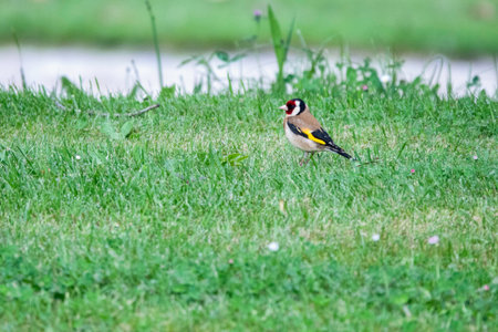 beautifull Carduelis carduelis bird or finch with red white and yellow colors in the wild in the grass in spain