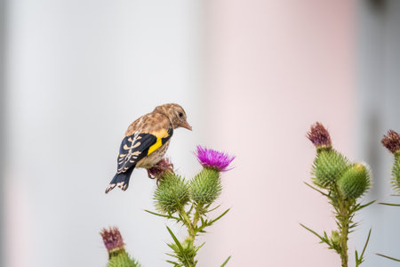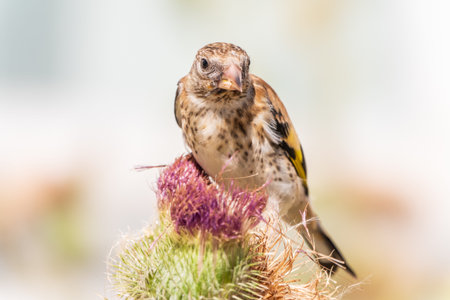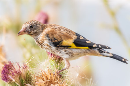 European goldfinch with juvenile plumage, feeding on the seeds of thistles. Juvenile European goldfinch or simply goldfinch, latin name Carduelis carduelis, Perched on a Branch of thistle