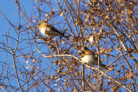 Brambling, Fringilla montifringilla, sitting on a stick with a seed in its beak on a beautiful background.