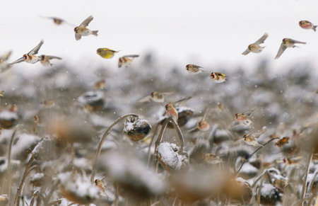 Flocks of various birds eating sunflower seeds on a sunflower field abandoned for winter and covered with snow