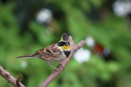 Yellow-throated bunting, Emberiza citrinella, single bird on rock, Warwickshire