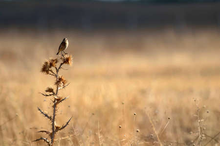 A common wheatear (Oenanthe oenanthe) perched on a dry thistle.
