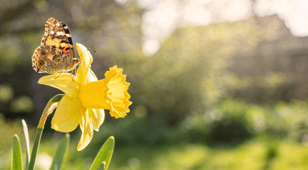 A creative digital illustration depicting Butterfly landing on a fresh daffodil in garden, close-up with bokeh background, soft filtered sunlight, delicate macro photography style, gentle and awakening mood, premium spring stock imagery.. This AI-generated artwork features unique visual elements suitable for various commercial and editorial applications. AI-generated illustration.