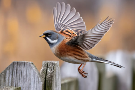Beautiful rustic bunting bird with open wings taking flight from a wooden fence in a natural setting