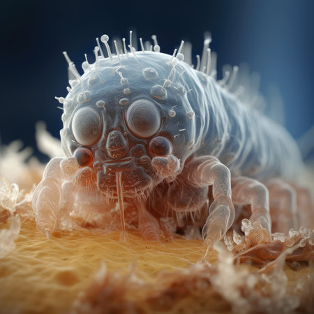 A close-up illustration features a dust mite on a textured surface, likely within a natural environment. The image displays detailed textures and subtle color variations. Potential uses include scientific publications, educational materials, and visual elements for health or allergen-related content.