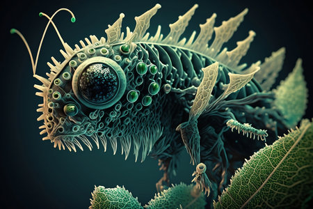 A highly detailed illustration depicts a microscopic bug with a blue and green color scheme. The image showcases intricate textures and forms, enhanced by the use of light and shadow. The dark blue background emphasizes the subject, suggesting a scientific or educational context. It could be used for illustrative purposes.
