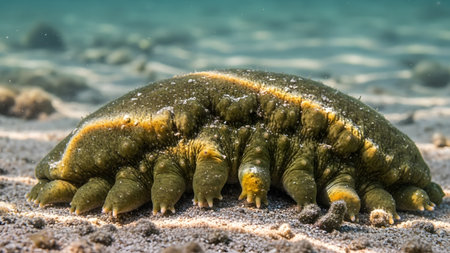 A detailed close-up shot focuses on a green, textured sea cucumber resting on a sandy ocean floor. The image highlights the creature's unique bumpy skin and small tube feet, showing the intricate details of marine life in a shallow reef environment.