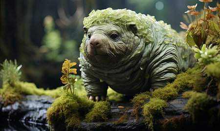 a little green creature is captured in a national geographic photo, nestled between two tubes. the realistic hyper-detailed rendering showcases its cute and colorful furry art. the light azure background adds a touch of tranquility, reminiscent of a persian miniature. ai generated