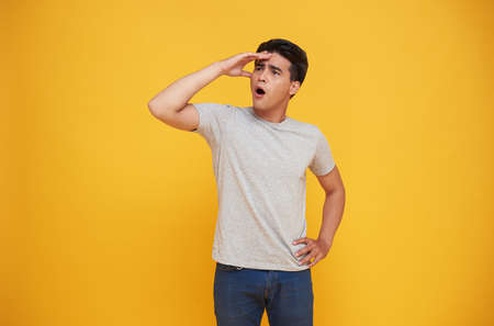 portrait of amazed young handsome Asian man looking in empty space aside in isolated studio yellow background.