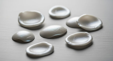 A collection of irregular shaped white pearls scattered on a light grey surface, showing detail.