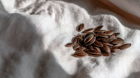 A detailed close-up shot of a small cluster of dark brown seeds resting on a light-colored, textured fabric, highlighting their natural texture and subtle shadows.
