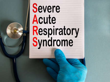 Hand in blue glove with stethoscope, white card with words 'severe acute respiratory syndrome'. COVID-19 pandemic concept.