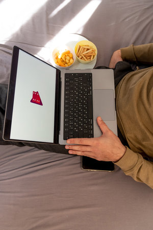 Man watching movie on Google TV platform site on laptop while sitting on bed at home