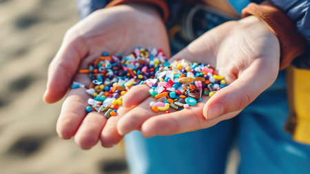 Close up side shot of microplastics lay on people hand. Concept of water pollution and global warming. Climate change idea. micro plastics concept in food and water or sea