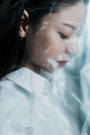 Right side of the woman in plastic bag with chin down.
