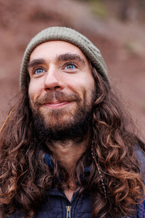 Portrait of a young smiling boy with curly hair, outdoors, wearing a jacket and hat.