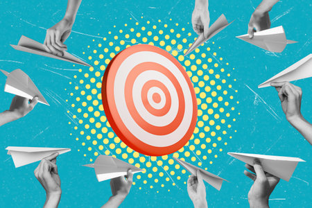 Various hands are launching paper airplanes towards a vivid bullseye target. The playful atmosphere emphasizes creativity and competition during this engaging challenge.