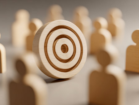 A wooden round target and wooden cubes with figure icon are connected, symbolizing the concept of target audience identification