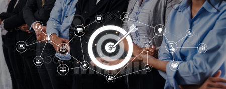 A group of professionals stands together, showcasing teamwork and collaboration to achieve business goals, enhanced by digital icons representing strategy and success.