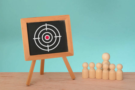 Wooden round target and wooden cubes with figure icon are connected, symbolizing the concept of target audience identification