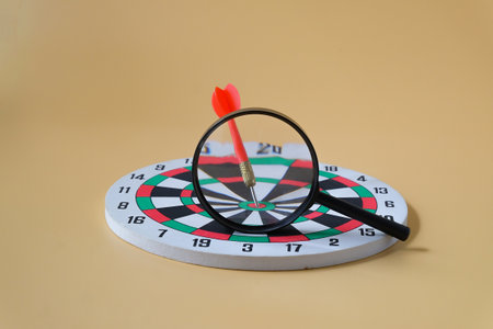 Target board inside of magnifier glass for focus business objective on white background and copy space. search and analysis of targets. Hand with magnifying glass holds its hand over target. wide