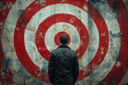 Young man is standing in front of a large, weathered target painted on a grunge wall