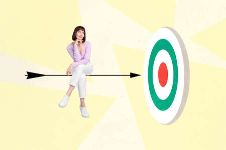 Cartoon style illustration of young business lady sitting on arrow flying straight to center of darts board concept of reaching professional goal easily