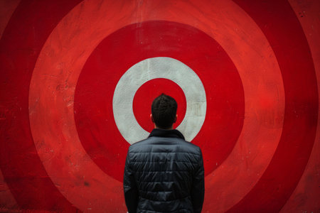 A surprised man with wide eyes and an open mouth stands in front of a bold red and white target, embodying a feeling of being the center of attention.