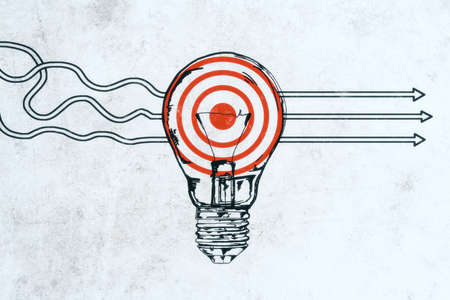 Red dart hit on the dartboard with white light bulb on the table, smart goal setting