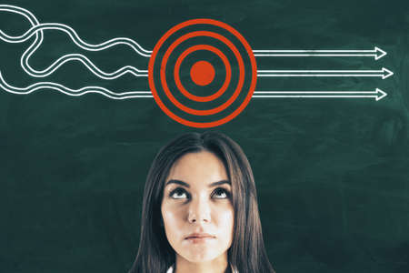 Businesswoman and drawing red target with arrows on blackboard. Leadership and way concept. Close up