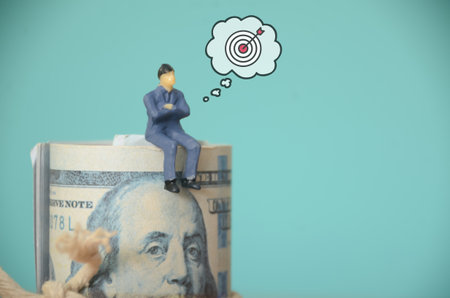 The businessman, seated atop a pile of money banknotes, is deep in thought, strategizing his next target for financial gain.