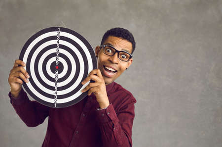 Studio portrait of happy excited black man holding shooting target, smiling and looking at camera. Concept of setting business objective, striking target audience, reaching goal and achieving success