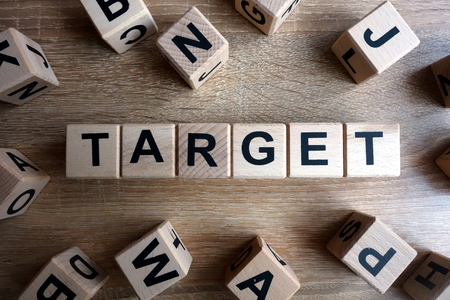 The text TARGET is written on the cubes in black letters, the cubes are located on a blue glass surface