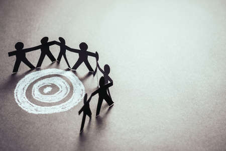 Paper human team stand around the target sketched by chalk with copy space
