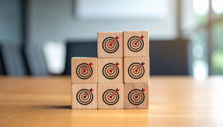 A hand positions a wooden block featuring a target symbol on ascending blocks, signifying the journey of goal achievement in a professional context.